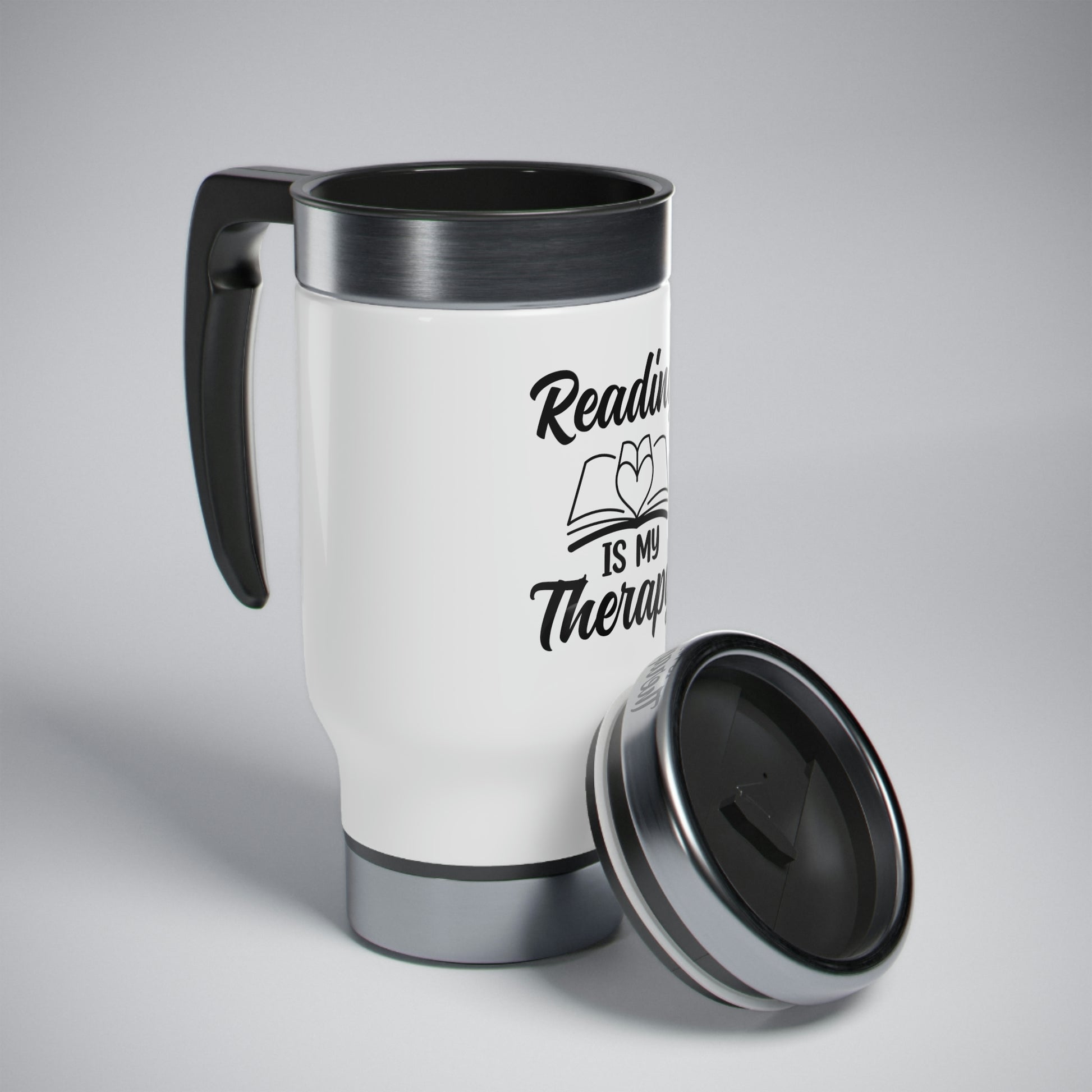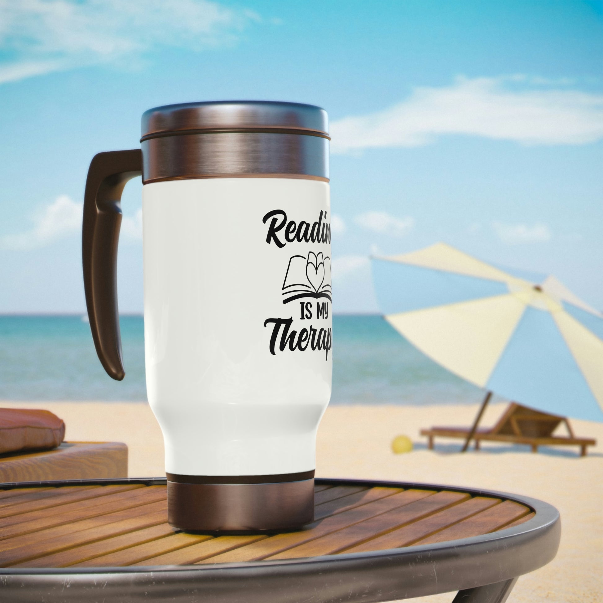 "Reading Is My Therapy" Stainless Steel Travel Mug with Handle, 14oz